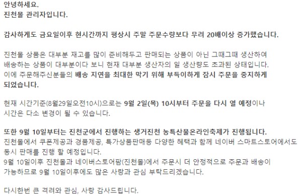 진천몰 상품은 대부분 재고를 많이 준비해두고 판매되는 상품이 아닌 그때그때 생산하여 배송하는 상품이 대부분이다 보니 현재 대부분 생산자의 일 생산량도 초과된 상태입니다. 이에 주문해주신 분드르이 배송 지연을 최대한 막기 위해 부득이하게 잠시 주문을 중지하게 되었습니다.