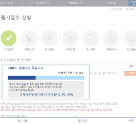모바일에서는 안 될수 있으니 심기일전 하고 PC로 접속합니다. 참 세무사, 감정평가사 등 전문가는 9시 접수이고 우리가 기다리는 기사 등 시험 접수 시간은 10시 시작입니다. 전 이 사실을 몰라서 9시에 기다리다 또 10시는 깜박해서 10시 십분에 들어갔습니다. 그래도 여전히 막히고 있네요.