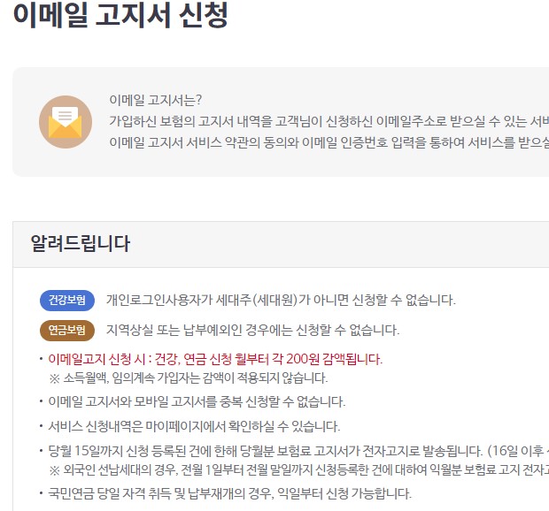 이메일의 경우 200원 감액되네요. 모르고 들어왔는데 왠지 기분이 좋습니다. 이런 임의계속 가입자는 해당이 안 된대요. 이런 너무합니다. 모바일과 이메일을 동시에는 안됩니다. 15일까지 신청하면 그 달부터 이메일로 받아볼 수 있다고 하네요.